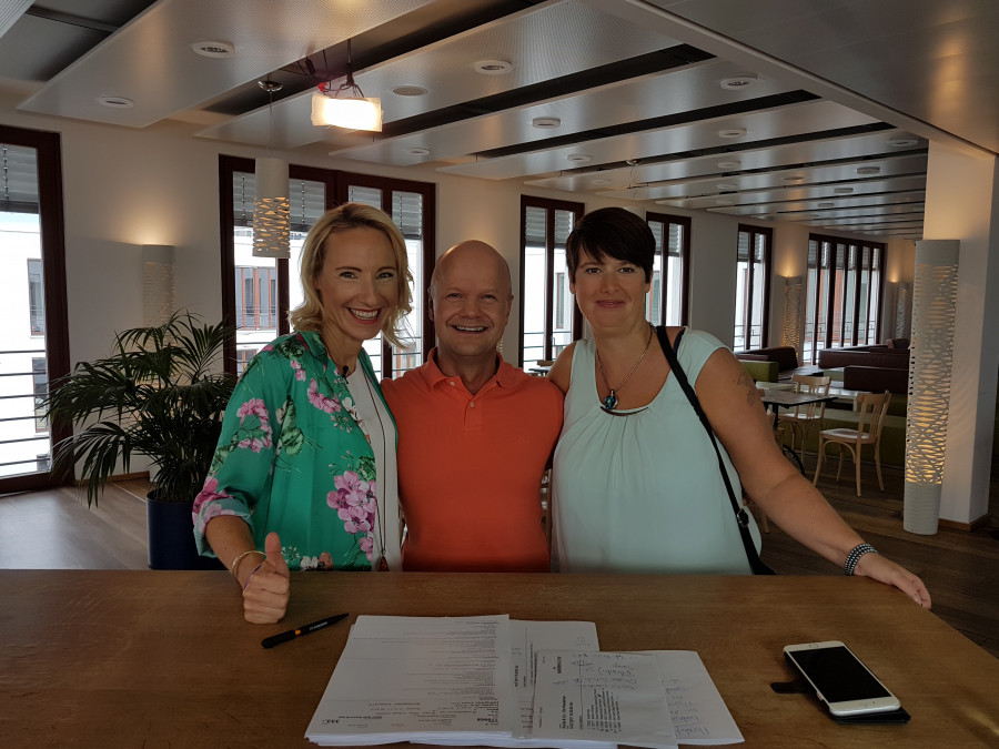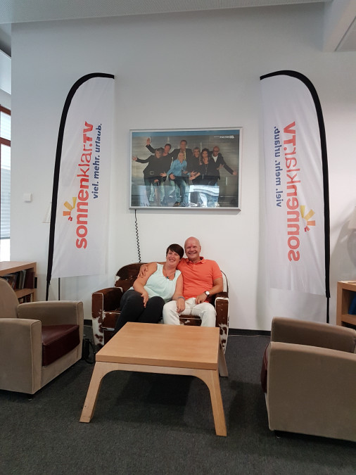 Zuerst wurden wir im Gästebereich des Studios herzlich empfangen. Die Gästebetreuung hat uns anschließend über den Ablauf bis zum Studioauftritt aufgeklärt. Dirk Löbling, ein Moderator des sonnenklar.TV-Teams, hatte seine Moderation inzwischen beendet und gab uns noch einige nützliche Tipps zum Studioauftritt. Dann stellte sich Sandra Hengeler vor, die unseren Reisebüro Experten Auftritt moderierte. Wir gingen nochmals kurz die Themenbereiche durch. Dann ging es ab in die Maske. Zuerst wurde ich schön gemacht, ich meine natürlich geschminkt, und dann war Sonja an der Reihe. Nach der Maske ging es ins Studio, hier war Sandra bereits on Air. Jetzt bekam ich ein wenig Lampenfieber. Nach einer kurzen Sendepause stellten wir uns neben Sandra am Moderationstisch und um 15:00 Uhr war es dann soweit, wir waren Live auf Sendung und das 45 Minuten lang, einfach super! Sandra führte uns klasse durch die Sendung, wir haben viel Spaß gehabt!